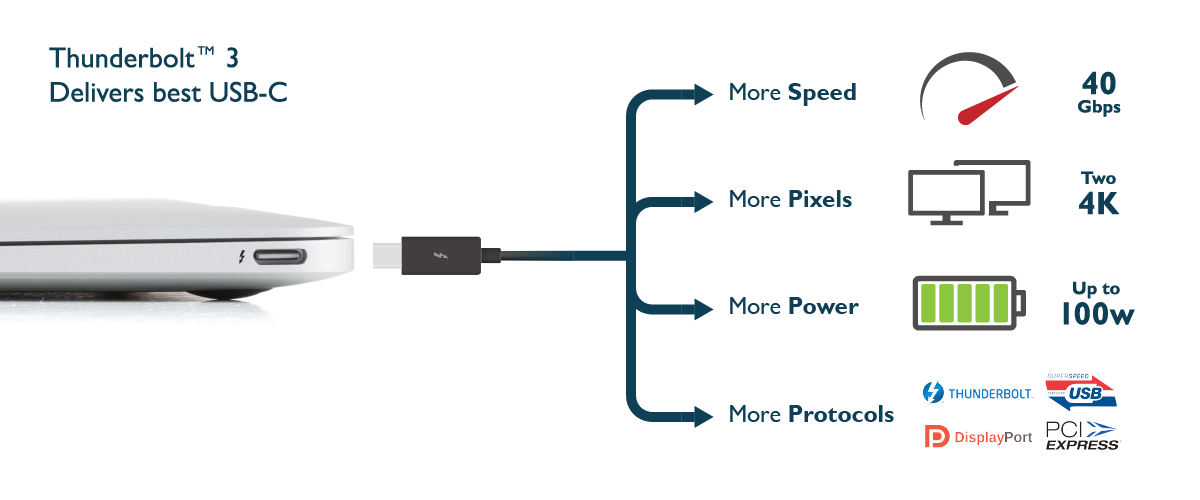 The raw throughput and supported resolutions depend on the displayport standard being used (at this stage, it’s likely 1.4). Thunderbolt 3 is designed as a usb type c port and, in addition to usb 3.1 gen 2 and displayport 1.3, also provides thunderbolt 3 as a transmission.